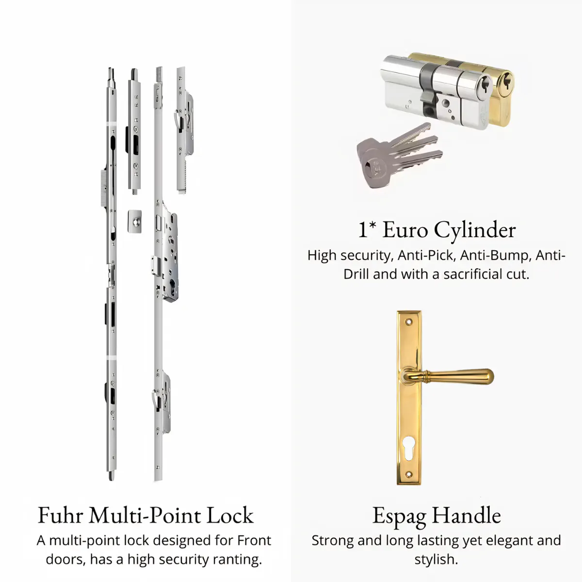 Our traditional French doors incorporate multipoint locking in three different places and the cylinder (where you insert your key) is specifically designed to provide a higher level of security. French door locks are incredibly difficult for people to break in.